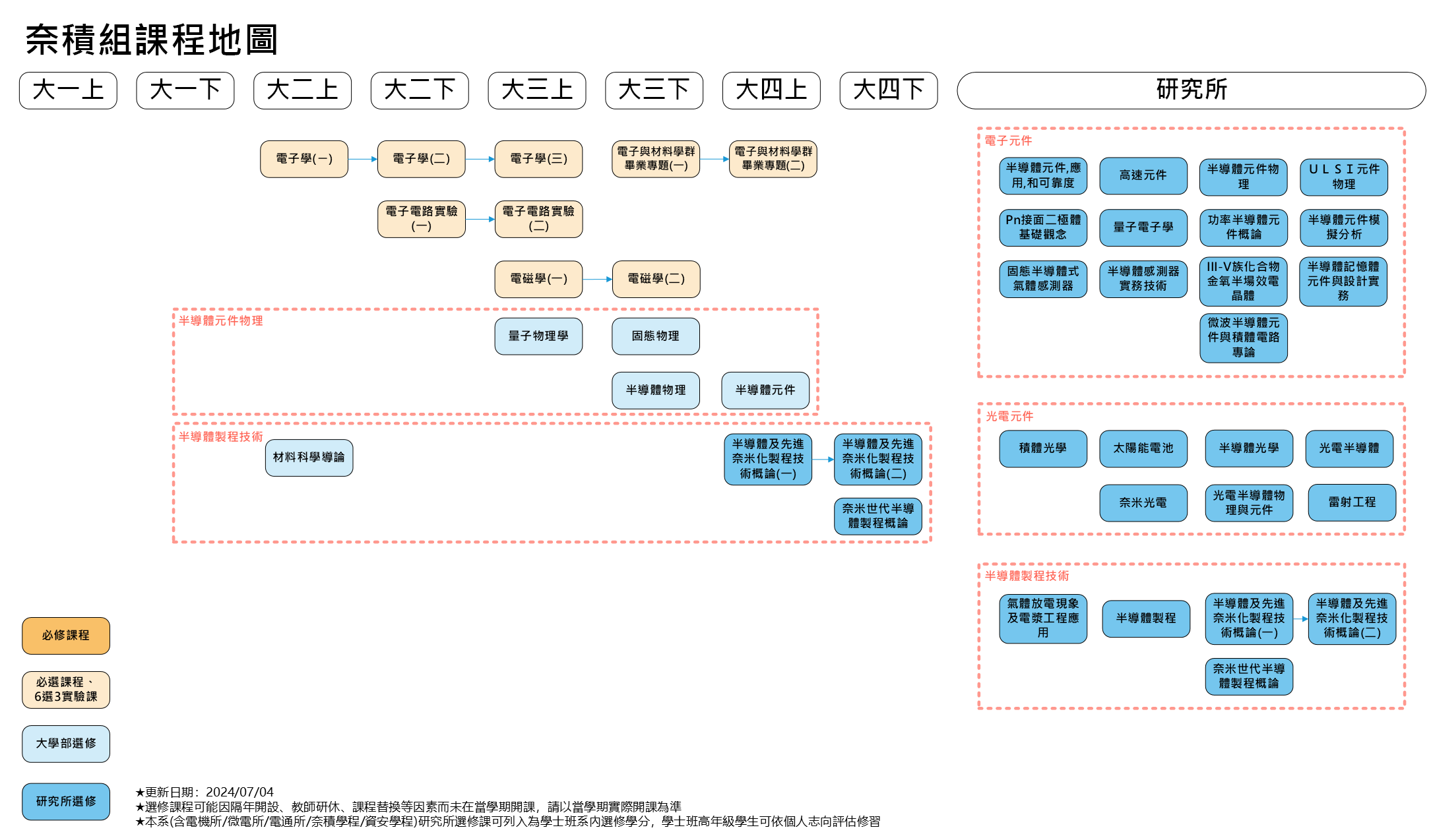 本所的發展主軸以半導體研究為基礎,主要培養從事半導體、光電、奈米材料元件的研究及開發等優秀人才,且學生在校所學之專業能力能為企業界所用。本所除可開設深且廣之專業科目外,在研究方面可互相支援且可為本所學生奠定紮實之基礎,並提供學生日後選擇往各電機專業系友領域發展之堅實後盾。以下為本所之核心課程列表。